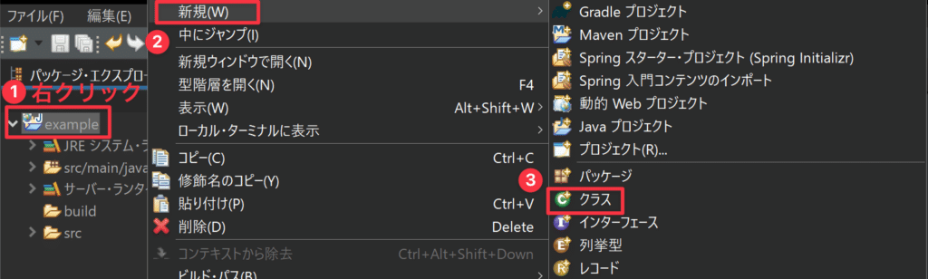 動的Webプロジェクトを選択して右クリック→「新規」→「クラス」を選択します。