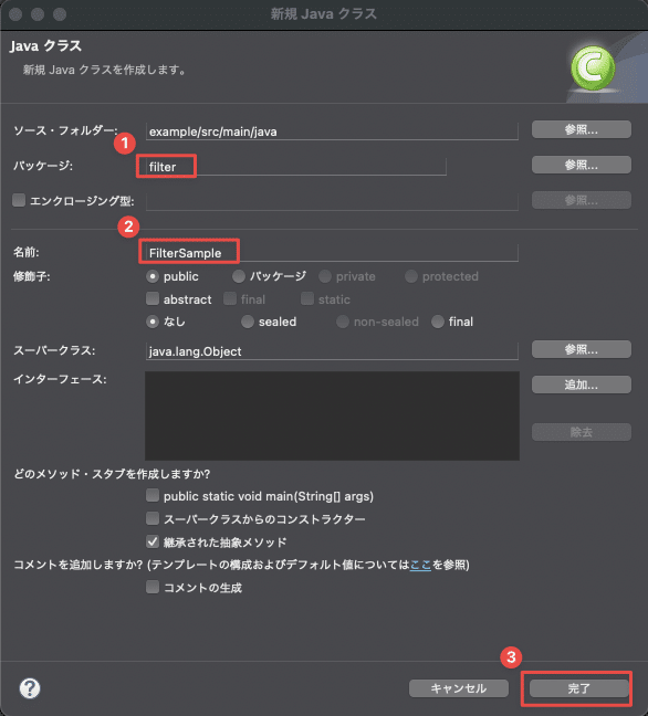 フィルターが所属するパッケージとクラス名を指定し、「完了」を押します