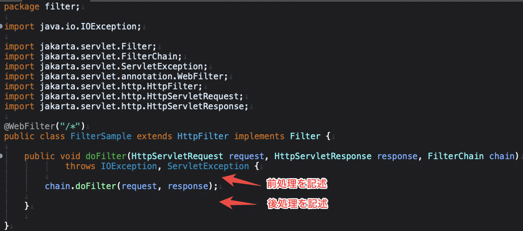 ⑤ doFilter()メソッド内の「chain.doFilter(request, response)」より上に前処理、下に後処理を記述します。