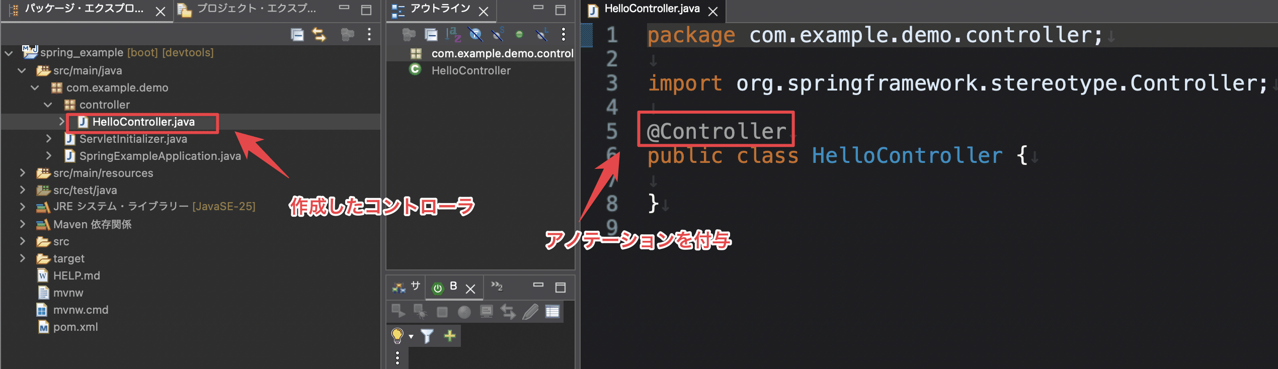 ・15章(15.2.2)のコントローラクラスの作成を行う場合は、パッケージは「com.example.demo.controller」、クラス名を「HelloController」にしてください。