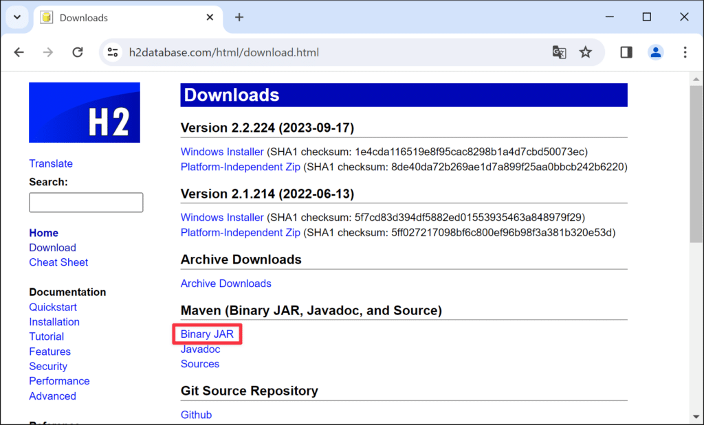 H2 Databaseのダウンロードページにアクセスします。「Maven」の「Binary JAR」をクリックするとJDBCドライバ「h2-x.x.x.jar」がダウンロードされます(x.x.xはバージョン番号)。