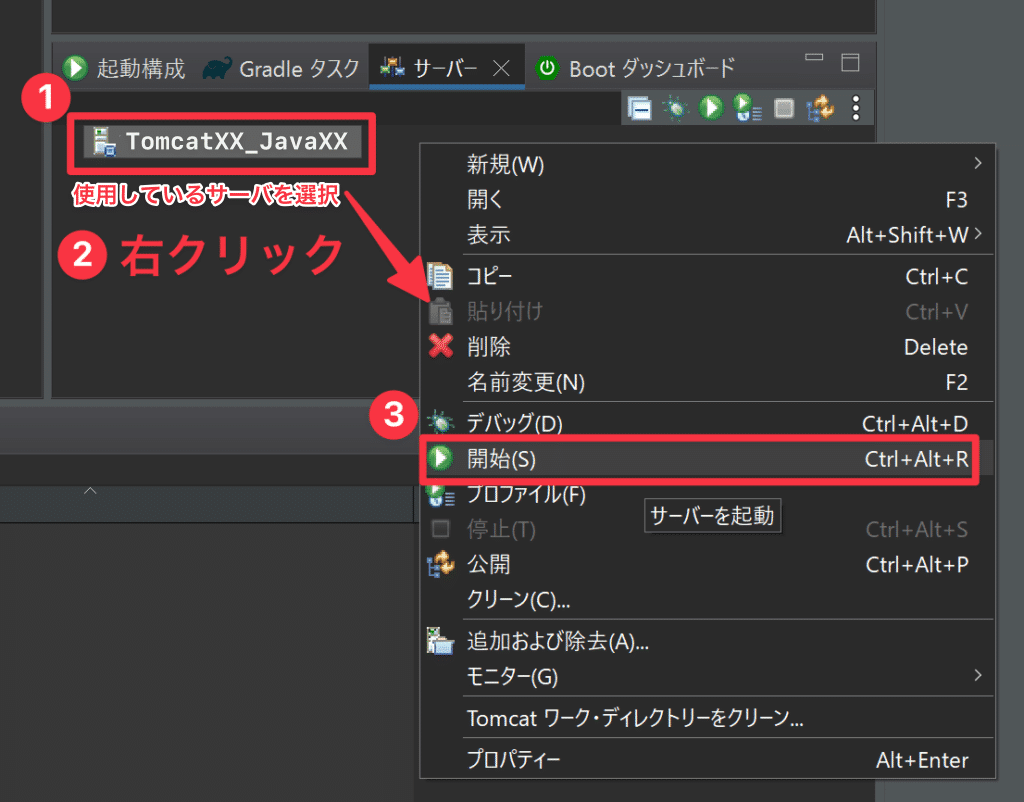 Eclipseでアプリケーションサーバーを起動、停止、再起動する手順を紹介します。